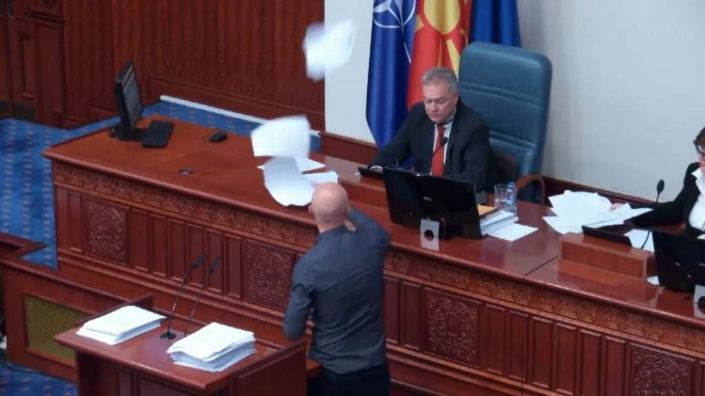 Incident në Parlament. Seanca është ndërprerë pasi dy deputetët e “Levicës”, Apasievi dhe Krrmovi kanë thyer kompjuterin e Zv/Kryetarit të Kuvendit, Goran Misovskit dhe kanë gjuajtur me letra në drejtim të tij.