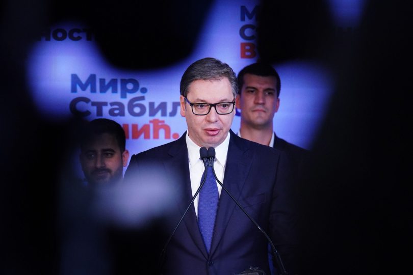 Aleksandar Vucic, Serbia's president, speaks during an election night event at the Serbian Progressive Party headquarters in Belgrade, Serbia, on Sunday, April 3, 2022. Vucic won a second term in office and his ruling party headed for an election victory, putting him on track to extend his coalitions decade-long grip on power. Photographer: Oliver Bunic/Bloomberg via Getty Images