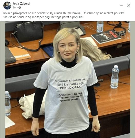 “Rolin e psikopates në ato serialet e saj e luan shumë bukur. E frikshme që në realitet po sillet sikurse në serial, e aq më tepër paguhet nga parat e popullit”, ka shkruar Zyberaj.